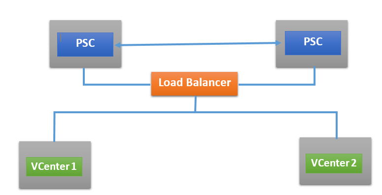 Now, as we can see that in above deployment PSC is a single point of failure. So in external deployment, to avoid failure of PSC, we deploy two PSC and put them behind load balancer. So, if one PSC goes down, requests will be redirected to second PSC. This configuration looks similar to below: