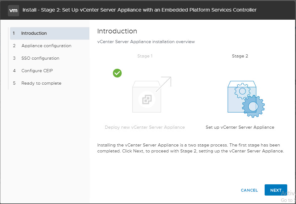 Step 1 – Click Next to start stage 2 with vCenter Server Appliance.