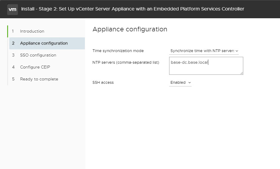Step 2 – You can enable time sync with host or configure to use External time server. Enable SSH access if required.