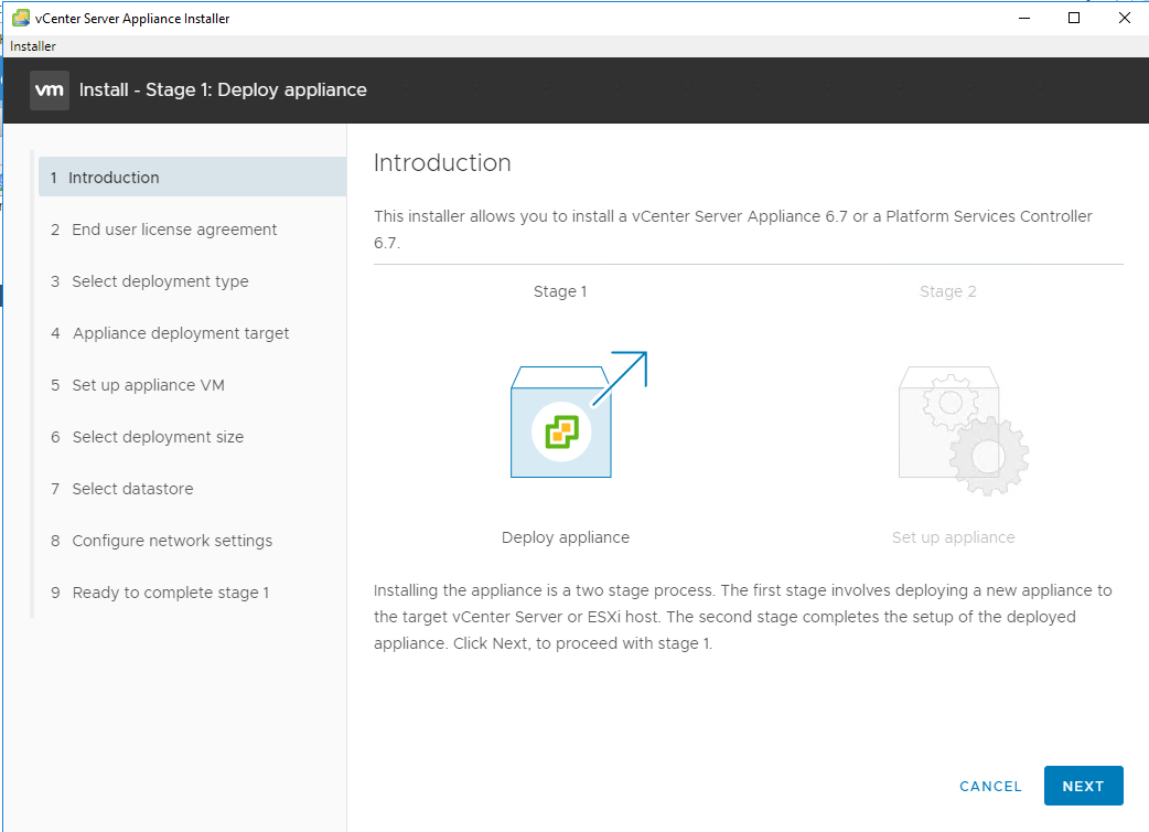 Step 4 – Click on Install as we are deploying a new vCenter server appliance. And we will be presented with Stage 1. Deploy Appliance.