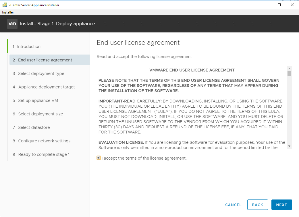 Step 5 – Click Next. Accept VMware EULA by checking the checkbox. Then click Next.