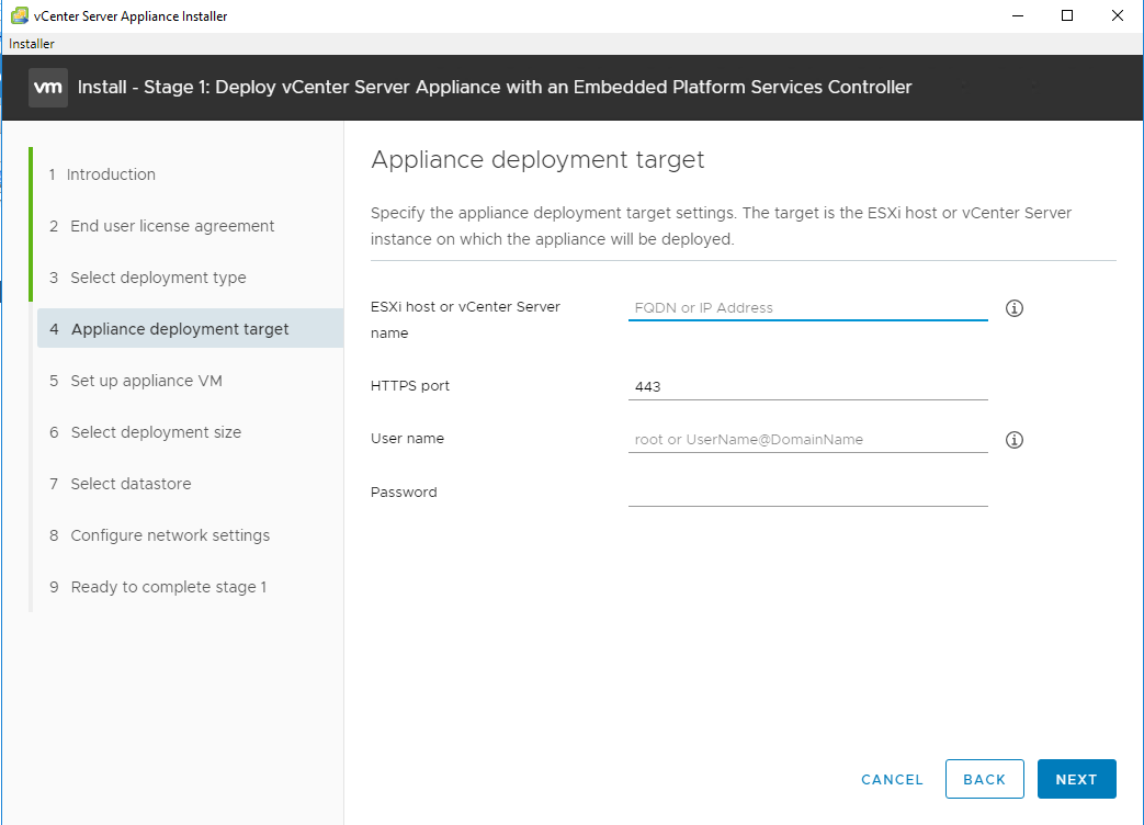 Step 7 – In this step, we need to provide target ESXi host or vCenter server and its credentials. As VCSA is an appliance and appliance is a VM, so it will need a prepared infrastructure ready to run. Provide ESXi or vCenter server name, and credentials.
