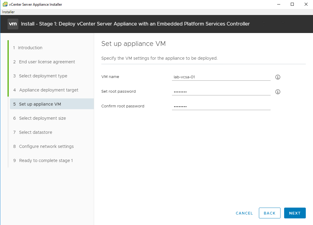 Step 8 – Provide name of vCenter server appliance VM and set its root password which we will need later on.