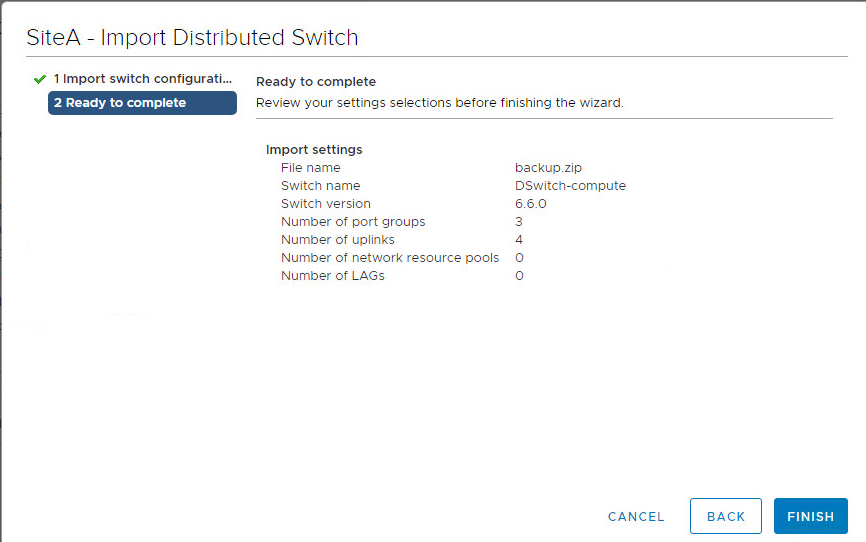 Step 4 – Click Next, review configuration and click on Finish to import distributed switch from backup.