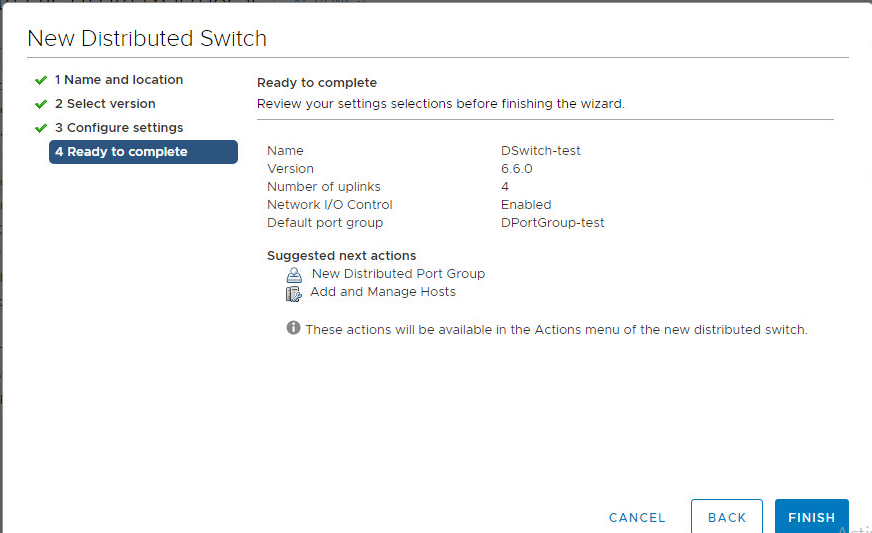 Step 6 – Review Settings and Click on Finish to create new distributed switch.