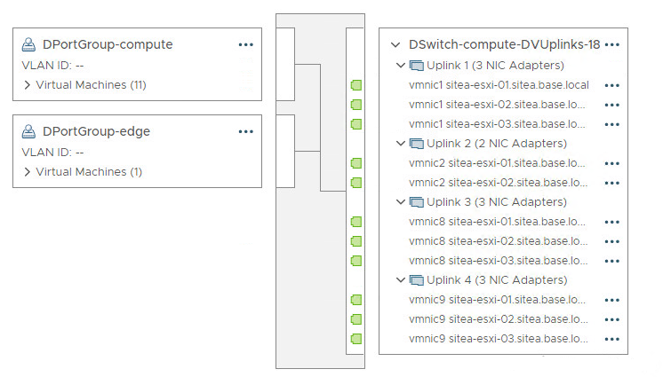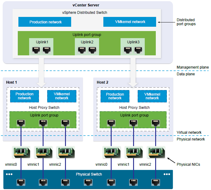 - Uplink Port group: An uplink port group or dvuplink port group is defined during the creation of the distributed switch and can have one or more uplinks. An uplink is a template that you use to configure physical connections of hosts as well as failover and load balancing policies. You map physical NICs of hosts to uplinks on the distributed switch.