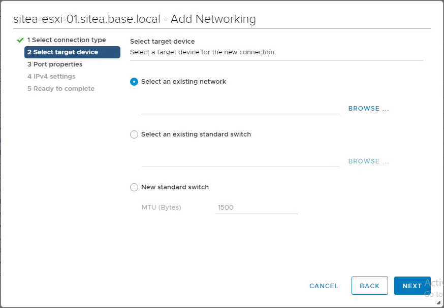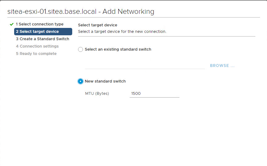 - New standard switch – To create a new standard switch for VMkernel adapter