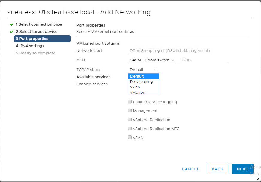 Step 5 – Here you will be presented with option to select TCP/IP stack and type of service traffic for VMkernel adapter.