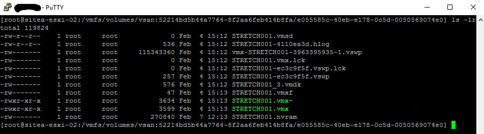 - <vm_name>.vmx – Virtual machine configuration file. This file contains all configuration related information such as number of vCPU, RAM assigned to VM, type of storage adapter etc. This is a crucial file and if this file is missing, VM will failed to power on.