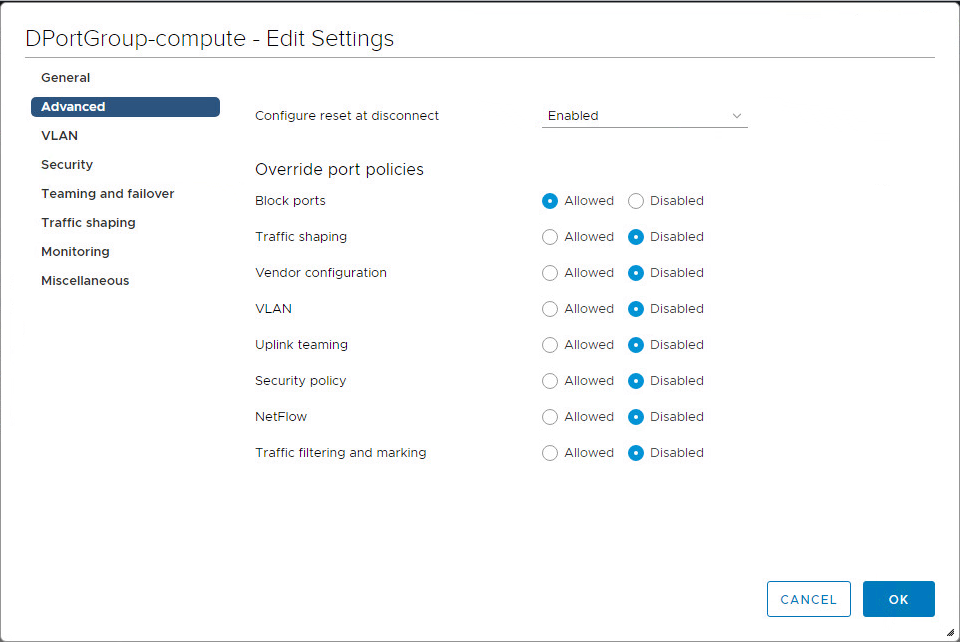 | Monitoring | No | Yes | Enables and disables NetFlow monitoring on a distributed port or port group. |