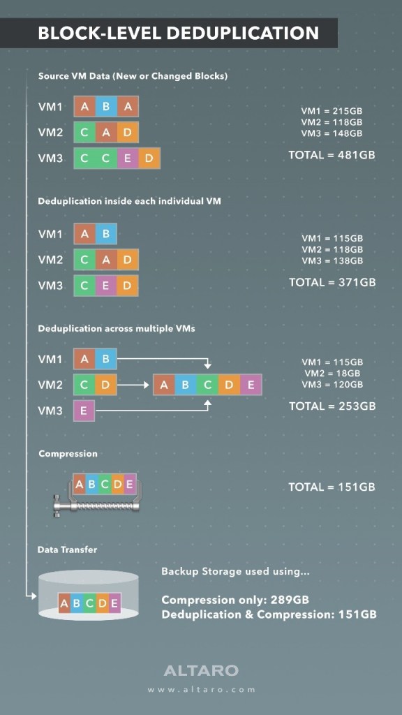 Altaro uses Augmented In-Line Deduplication. Augmented In-line Deduplication is a space saving technology developed by Altaro Software that ensures that common blocks of data, both in a singular VMs data and across multiple VMs globally, are transferred and stored on the backup location once. This deduplication technology stands out from others as it uses variable block size for maximum efficiency and also offer in-line cross-VM deduplication – so that means no need for post-process deduplication.