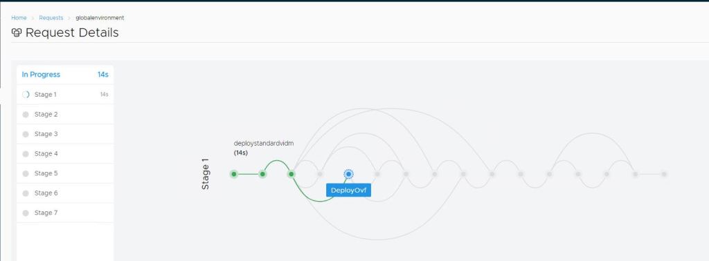 - After vRLCM is powered up, login into it. Go to requests. You will be able to see different environment creation in progress.