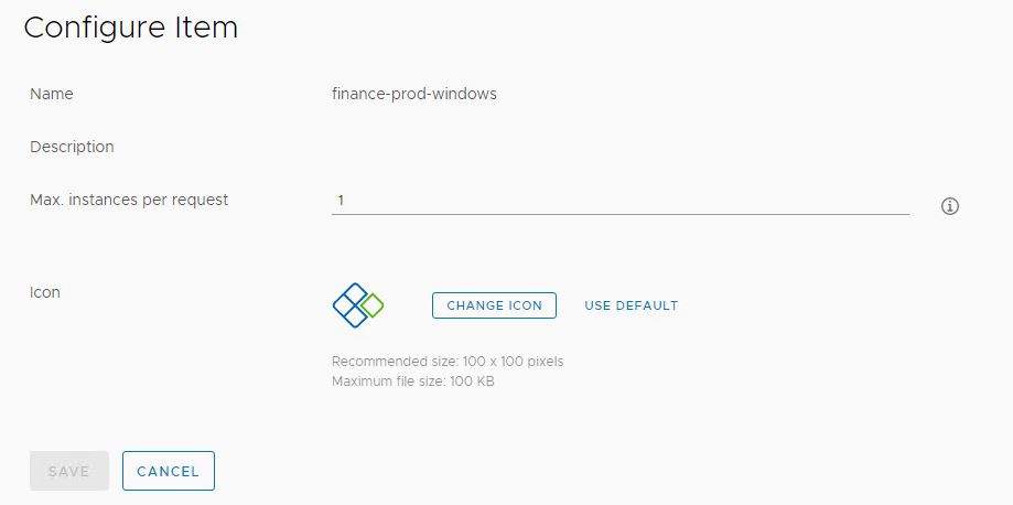 1. If you had clicked on Configure Item, it will provide options to change Icon and the maximum number of instances that can be deployed per request.