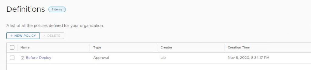 1. Below screenshot shows a sample Approval Policy. This policy define that before any deployment is created, it needs to be approved Approver admin sitea. If approver do not take any actions then it will be auto Rejected.