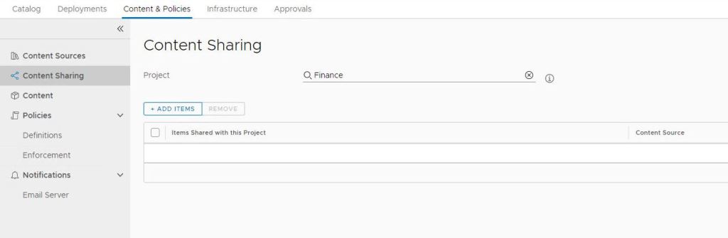 1. Once we have Content Sources configured, we enable Content Sharing and share item with Users of Project to enable deployments. Select the project that includes the users who should be able to deploy the blueprints and Click Add Items