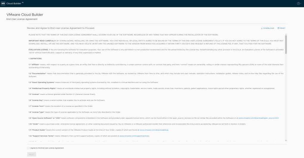 - Login into Cloud Builder using admin credentials setup during deployment. Agree to terms to proceed forward.